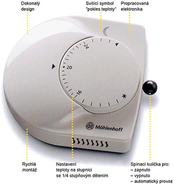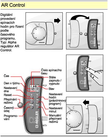 Spínací kulička po straně regulátoru ukazuje stav: Měsíček: útlumový provoz, "0": provoz podle nastavené stupnice, Hodiny: regulování podle časového programu (spínací hodiny nejsou standardně součástí regulátoru, nutno objednat).